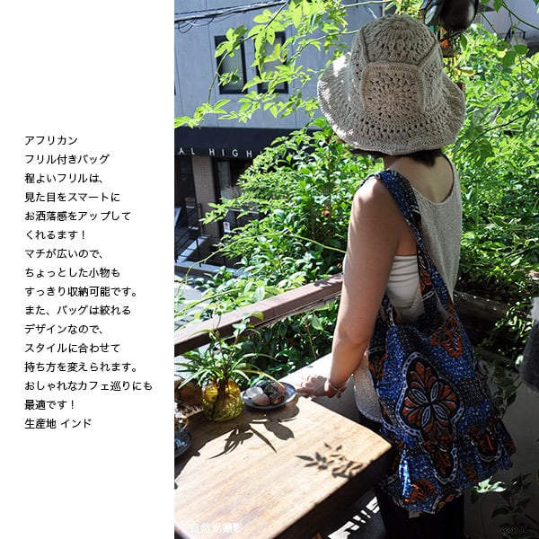アフリカンバッグは、アフリカンプリントの独特なデザインが目を引く魅力的なアイテムです。フリルのデザインが楽しく、カジュアルなコーディネートにぴったり!お友達とのお出かけやちょっとしたお買い物に使える便利さがあり、必ずやあなたの日常を彩ってくれます。マチが広いので、ちょっとした小物もすっきり収納可能です。また、バッグは巾着型に絞れるデザインなので、スタイルに合わせて持ち方を変えられます。おしゃれなカフェ巡りにも最適です!生産地 インド