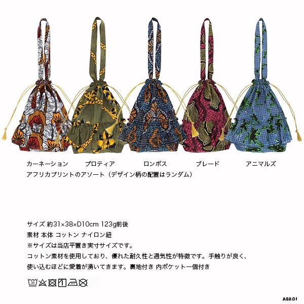 【 送料無料 メール便発送 】 アフリカンバッグ アフリカンプリントバック バッグ BAG アフリカ柄 巾着バッグ フリルバッグ レディース 女性 フリルトート おしゃれで個性的な巾着バッグ!南部アフリカの美しいプリント柄が魅力のアイテムです。スカートのような可愛いフリルが、女性らしさを引き立ててくれます。マチがしっかりあるので、収納力抜群。絞ってもそのまま持ち運べて、自分好みにスタイリングできるのがポイントです。お出かけやデイリーユースにピッタリなバッグをあなたのコーディネートに おすすめ アブロイ ABROI