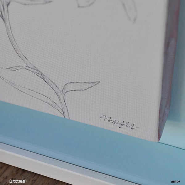 キャンバスの側面には、それぞれの花がもつ本来の色彩を忍ばせるように彩色。正面からは静謐な線画、横からは命の色を感じる――見る角度によって表情が変わる、奥行きのある作品です。