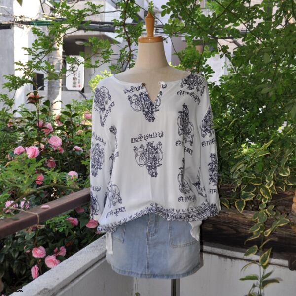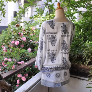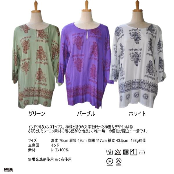 インドクルタメンズトップス。神様と祈りの文字をまとった神聖なデザインは◎さらりとしたレーヨン素材の落ち感が心地良い。唯一無二の個性が際立つ一着です。生産国 インド