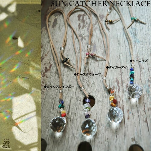 サンキャッチャー おしゃれなサンキャッチャーネックレスは、シンプルなスタイルへも相性の良いネックレスはタートルネックへも快適にご使用が可能です。丁寧に作られたハンドメイドサンキャッチャーからは太陽の光によって七色サンシャワーを作ることができます。野外のヨガアプローチにも使えます。ネックレスは重さも気になりません。全ての天然石には浄化の石、クリスタルが使われています。配色はトータル的にバランスの取れたネックレスです。