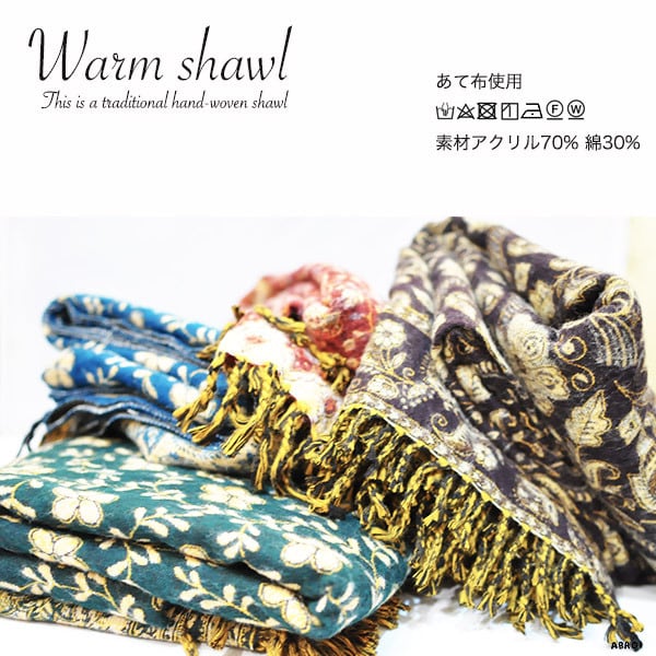 ヴィンテージなボタニカル柄のストール。使い方自由自在な大判なサイズ。エレガントで格好良いデザインです。アクリルなので暖かさもバッチリ!!柄はアソートになります。 おしゃれショールは、両面をリーバーシブルに幅広くに使えるアイテムです。配色は顔写り一段とを良くします。暗くなりがちな秋冬ファッションのアクセントへぴったりです。ポリューム満点ですよ!小顔効果も期待!これからの季節はプレゼントにもぴったり!インパクトのあるストール。シンプルカジュアルなコーディネートのアクセントとして取り入れやすいアイテムです。 生産国 ネパール